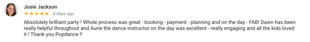 Emily was enthusiastic and friendly and we would recommend Popdance and Emily to any friends who asked. Thank you for all your help with this."